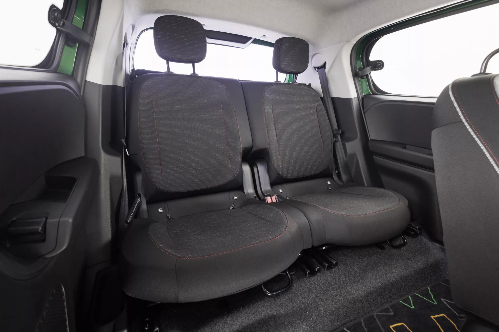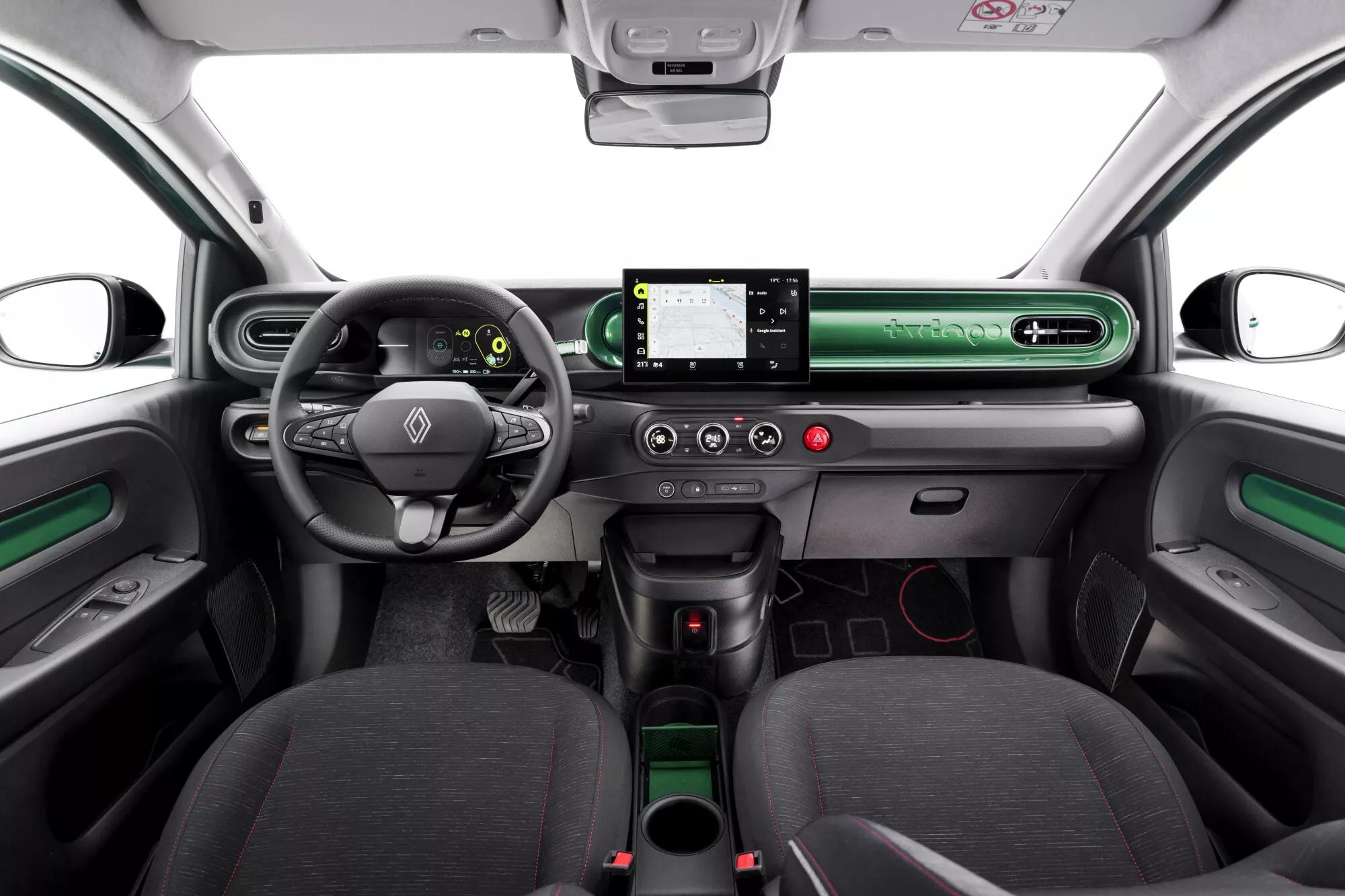 Στο εσωτερικό μέρος, συναντάμε μια ψηφιακή οθόνη των 7in για τον πίνακα οργάνων, ενώ στο κέντρο βλέπουμε μια οθόνη των 10in για το infortainment σύστημα. Όπως και σε άλλα μοντέλα της Renault, έτσι και στο Twingo συναντάμε τρεις μοχλούς πίσω από το τιμόνι, όπου ο ένας χρησιμοποιείται για το αυτόματο κιβώτιο ταχυτήτων. Ανάλογα με το πακέτο, η Renault προσφέρει και το εσωτερικό μέρος σε διάφορα χρώματα. Για παράδειγμα, το πακέτο techno προσφέρει το ταμπλό στο ίδιο χρώμα με το αμάξωμα ενώ τα καθίσματα είναι υφασμάτινα με χρώμα γκρι προς μαύρο μαζί με κόκκινες ραφές.