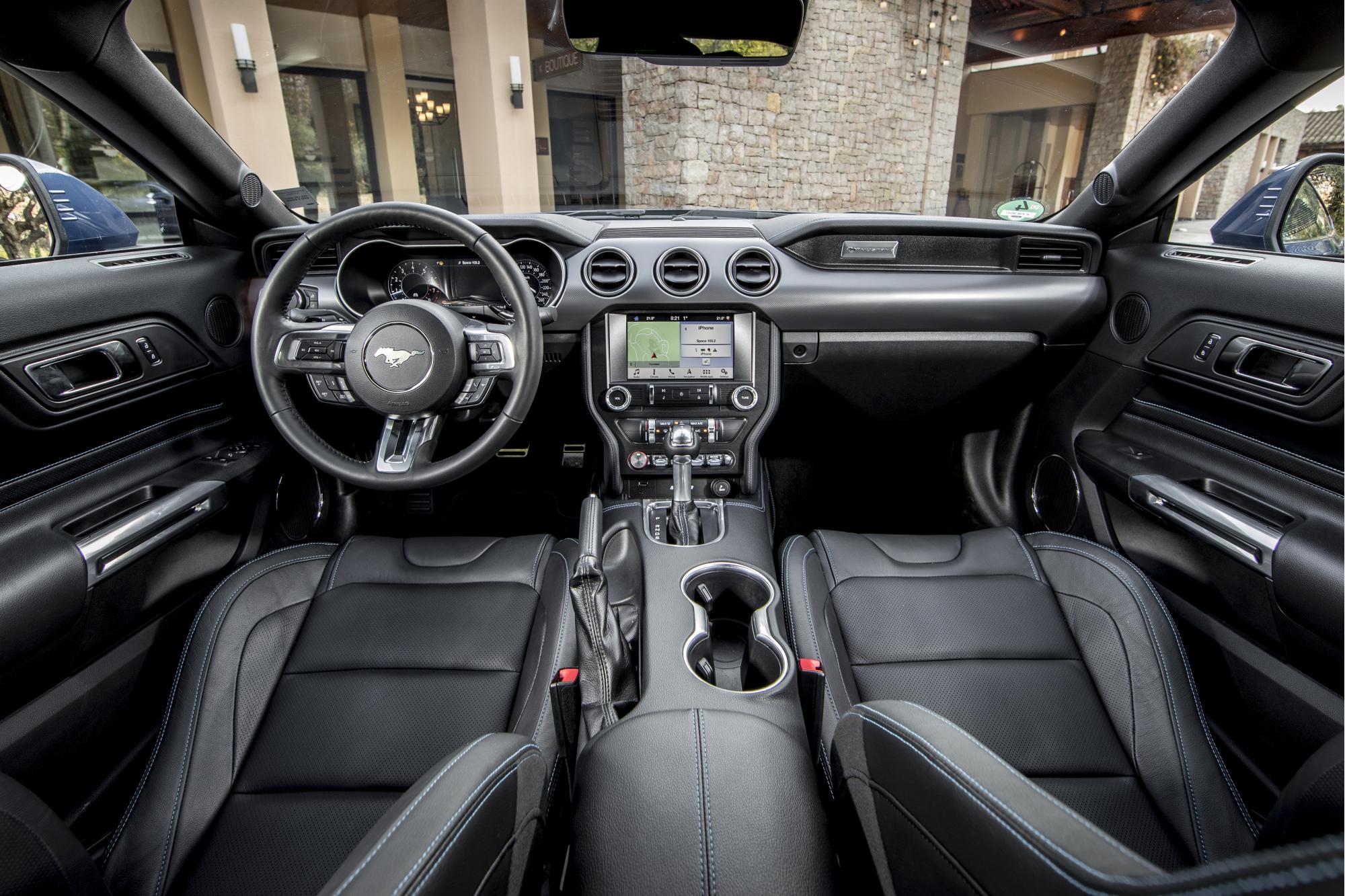 Το macho μοτίβο παρέμεινε, με περιορισμένες, αλλά σημαντικές αλλαγές να κάνουν τη διαφορά και να φέρνουν ένα πιο επιθετικό παρουσιαστικό. Οι επεμβάσεις στο αμάξωμα εστιάζουν κυρίως στο μπροστινό μέρος, με το χαμηλότερο και πιο μυώδες καπό, τα «κατεβασμένα» φτερά, το αεροδυναμικό splitter και τα νέα φωτιστικά σώματα με τεχνολογία LED να κάνουν τη νέα Mustang να μοιάζει με …«αρπακτικό έτοιμο να χιμήξει». Είχα τις αμφιβολίες μου για τις αλλαγές στο μπροστινό μέρος, αφού η Mustang του 2015 ήταν ένα πολύ αρμονικό σύνολο, με σχεδίαση αναμφισβήτητα... Mustang. Το νέο μοντέλο όμως -από κοντά- είναι ακόμα καλύτερο. Στο εσωτερικό έχει γίνει μία φιλότιμη προσπάθεια για πιο premium «αύρα» χάρη στις νέες δερμάτινες επενδύσεις στις πόρτες και στα καθίσματα, ενώ η κεντρική κονσόλα υιοθετεί επένδυση μαλακού πλαστικού στο πάνω μέρος. Στο κέντρο συναντάμε φυσικά την οθόνη αφής 8in με το σύστημα SYNC3, αλλά, αυτή τη φορά, την παράσταση κλέβει ο εντυπωσιακός ψηφιακός πίνακας 12in, όπου μπορείς να επιλέξεις ανάμεσα από αρκετές εναλλακτικές απεικονίσεις. Τα μοτίβα αλλάζουν ανάλογα με το επιλεγμένο προφίλ οδήγησης. Μπορείς επίσης να φτιάξεις το δικό σου προφίλ και να το αποθηκεύσεις ως «My Mode», ώστε να μπορείς να το ανακαλείς αμέσως. Για πρώτη φορά η Mustang διατίθεται με ένα ολοκληρωμένο πακέτο συστημάτων υποβοήθησης οδηγού, όπως τα Pre-Collision Assist με Pedestrian Detection, Lane Departure Warning και Lane Keeping Aid.