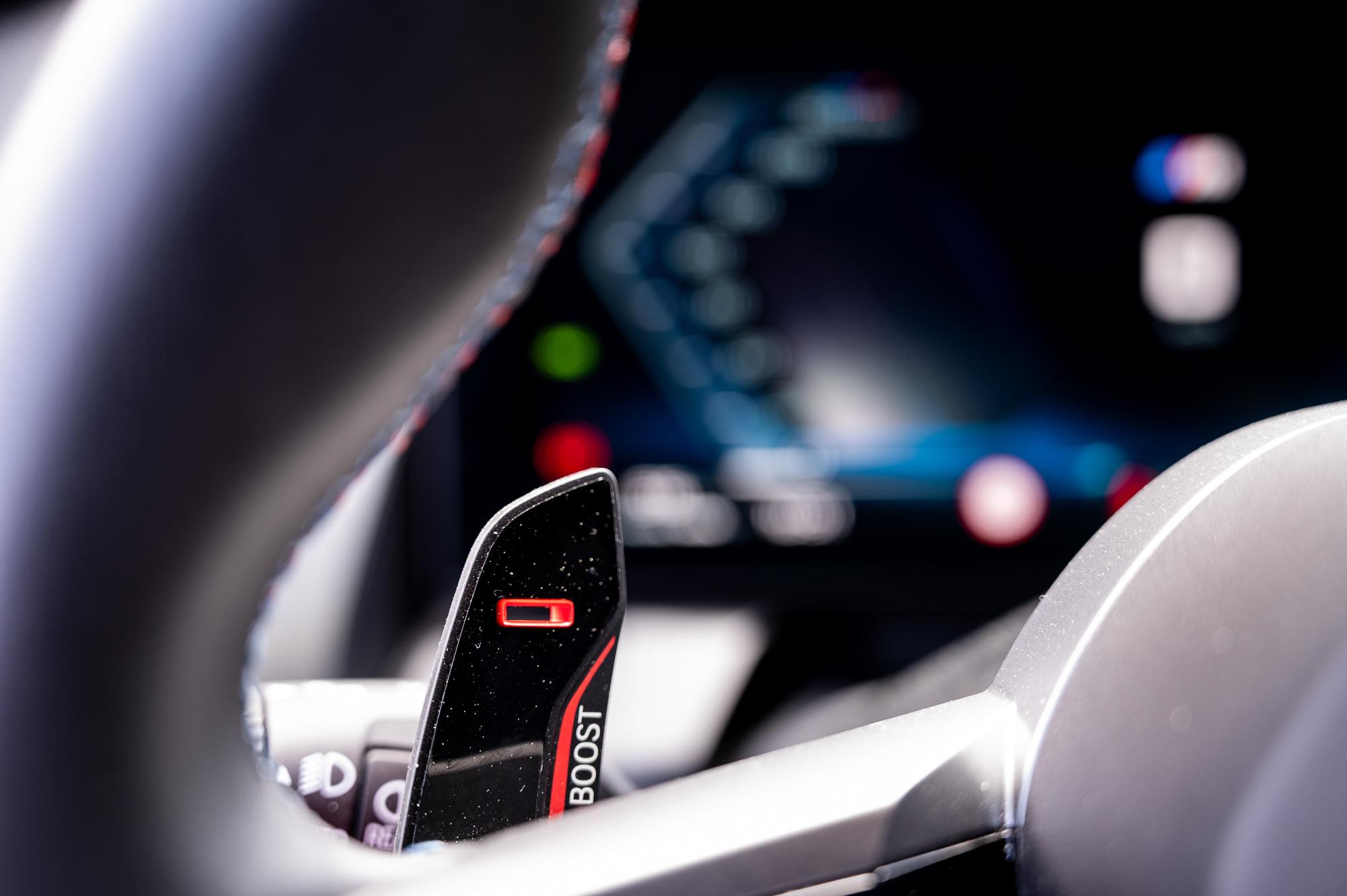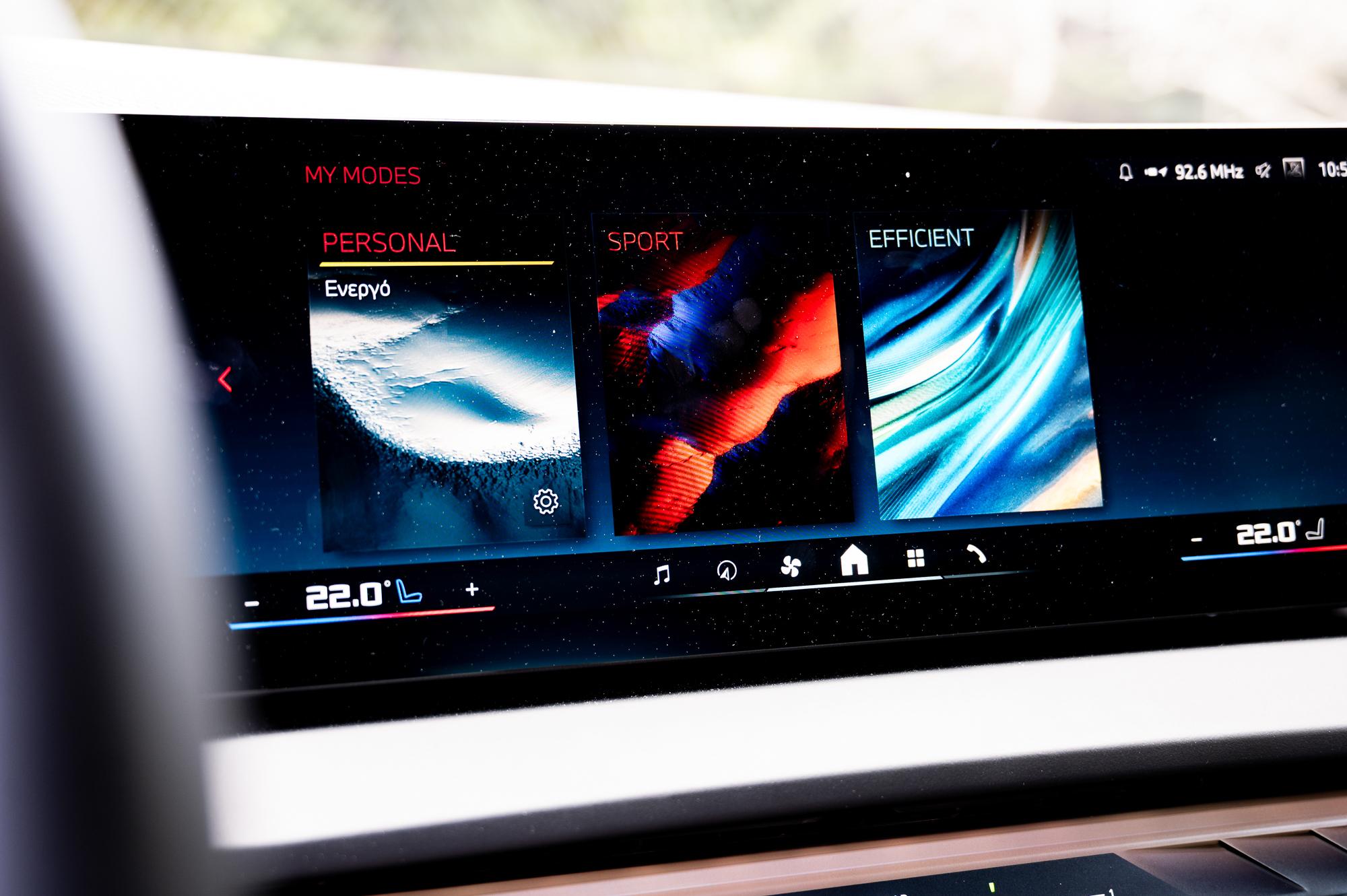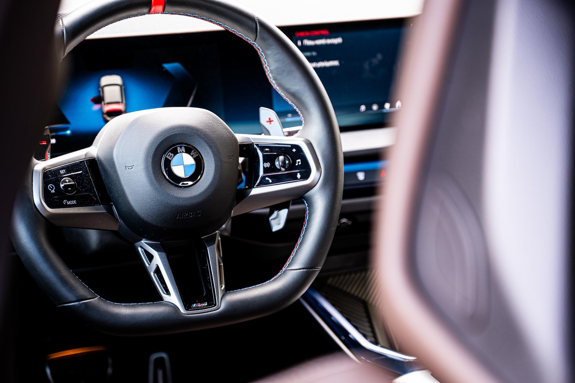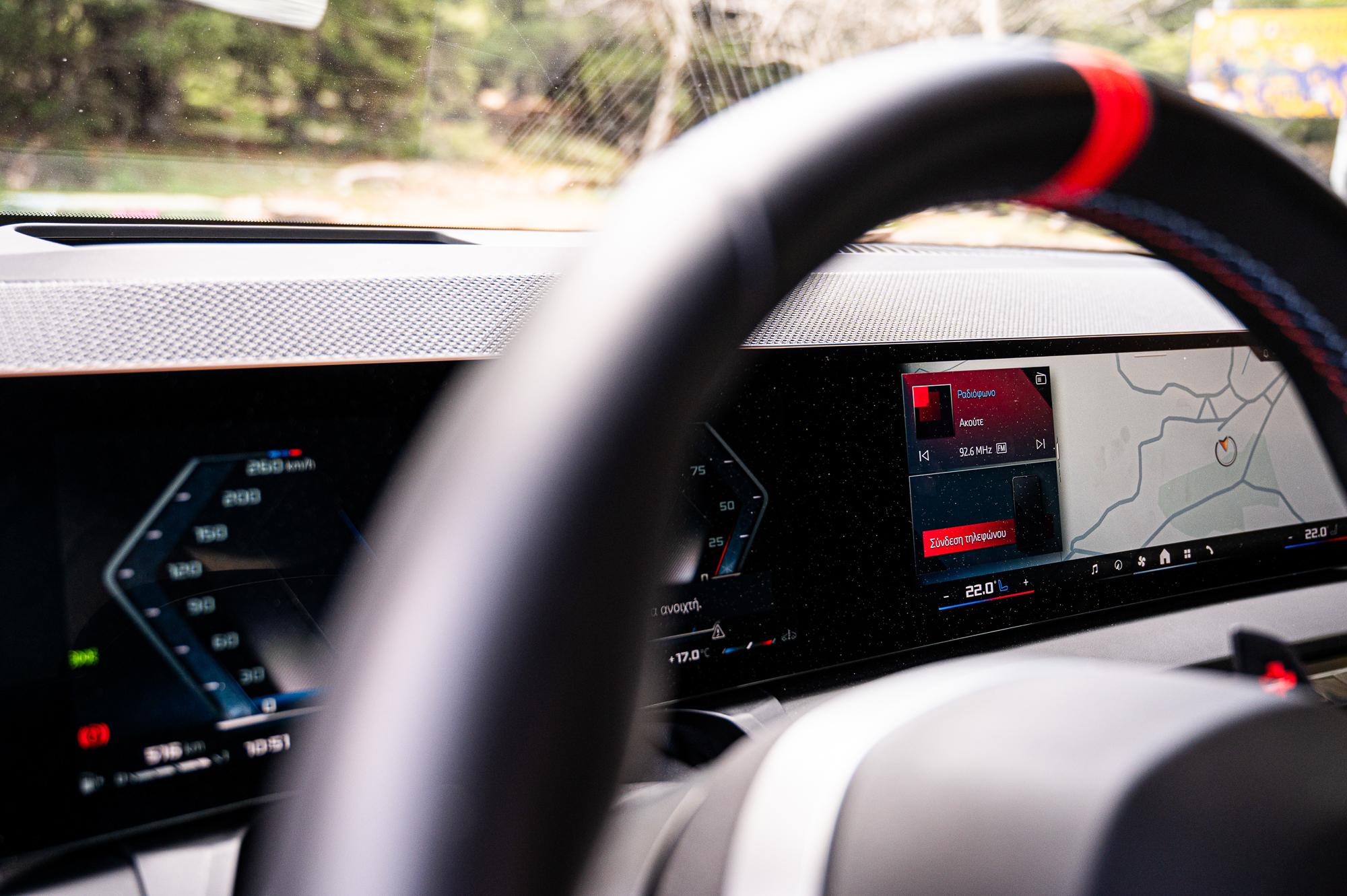 Το ψηφιοποιημένο περιβάλλον γενικότερα κυριαρχεί, με ελάχιστους φυσικούς διακόπτες, περιορισμένους στην κεντρική κονσόλα και τις δύο κυρτές οθόνες του BMW Curved Display που συνδυάζει έναν ψηφιακό πίνακα οργάνων 12,3in και μια οθόνη infotainment 14,9in, αμφότερες υψηλής ανάλυσης και εξαιρετικής απόκρισης. Σε συνδυασμό με το flat-bottom τιμόνι διαμορφώνουν ένα σαφώς οδηγοκεντρικό και σπορτίφ κόκπιτ.