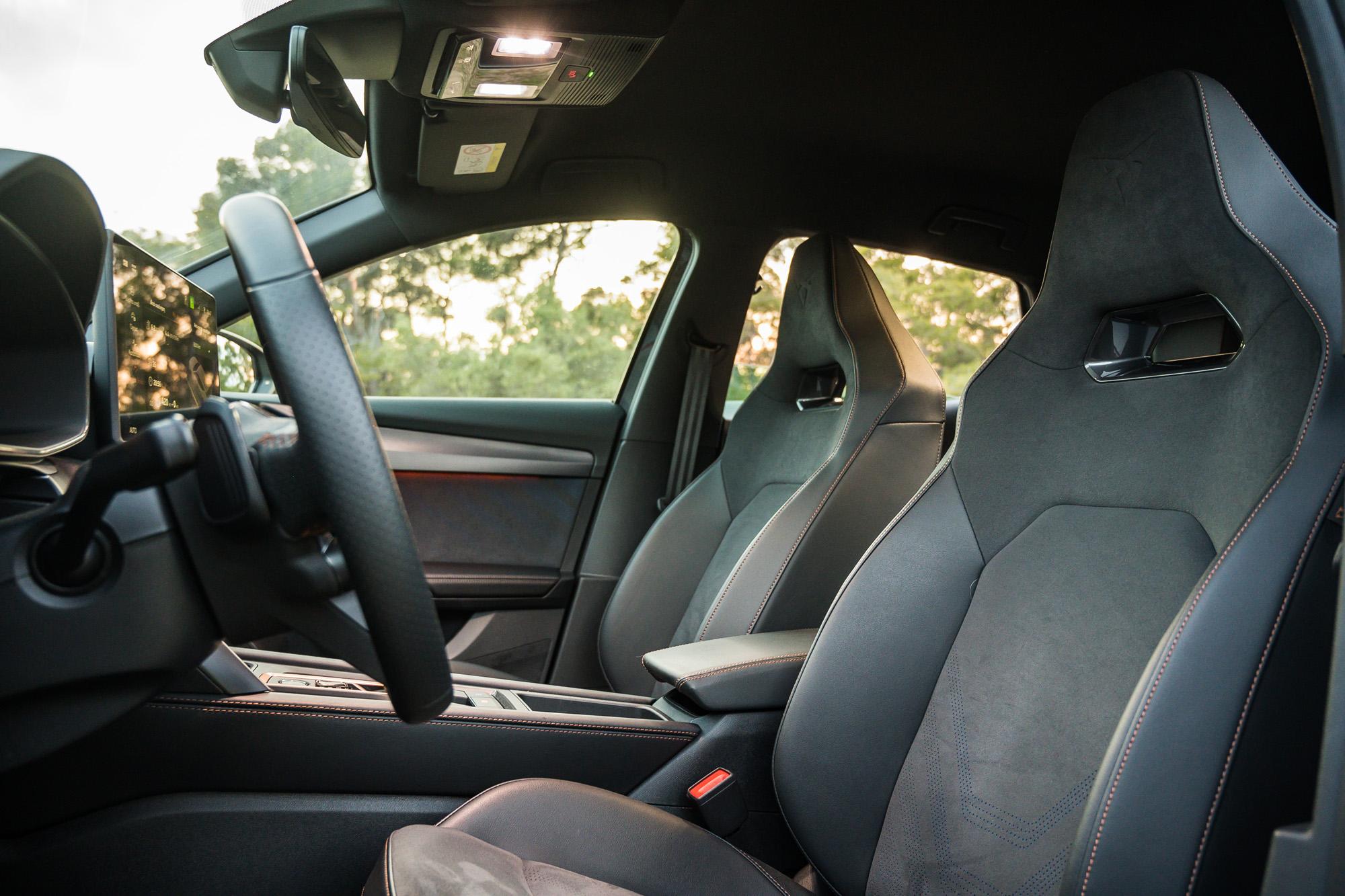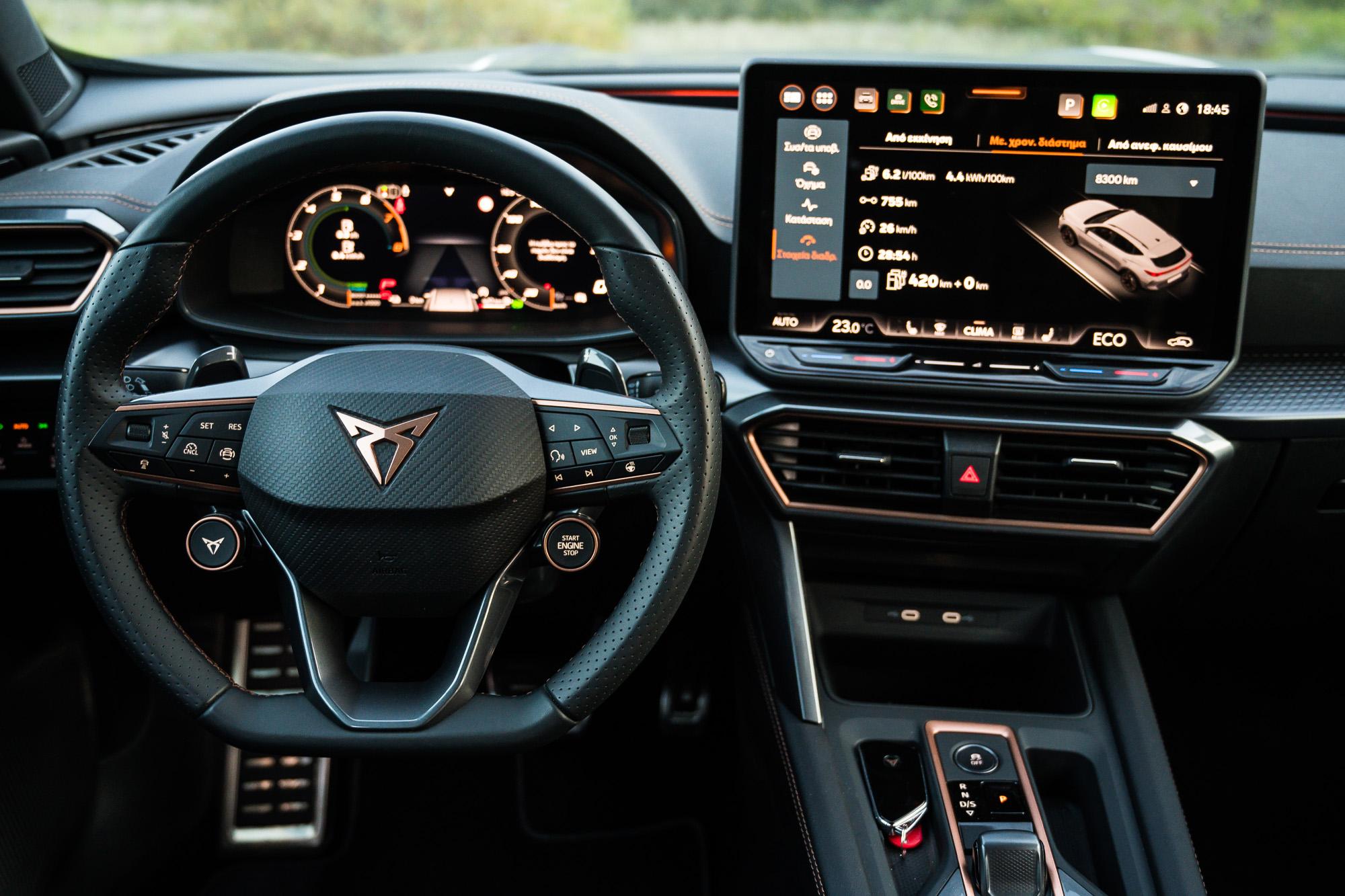 Ουσιαστικά έχει βελτιωθεί αρκετά το κομμάτι της εργονομίας, αφού περιηγείσαι και χειρίζεσαι πιο εύκολα τα μενού και τα υπομενού του συστήματος, χωρίς όμως και πάλι να μιλάμε για κορυφαία επίπεδα εργονομίας. Κορυφαία ωστόσο είναι η θέση οδήγησης με το μπάκετ κάθισμα της έκδοσης VZ να ενισχύει τον σπορ χαρακτήρα του Formentor, ενώ μόνο και μόνο γι’ αυτόν τον ευχάριστο συνολικά οδηγοκεντρικό του χαρακτήρα θυσιάζεις το γεγονός πως δεν είναι και τόσο SUV αισθητικά, αλλά και σε πρακτικότητα. Όσον αφορά στους χώρους, οι αυτοφορτιζόμενες υβρικές εκδόσεις του Cupra Formentor επηρεάζονται από την μπαταρία του συστήματος και μειώνουν το χώρο αποσκευών στα 345lt, από τα 450lt των συμβατικών του εκδόσεων, κάτι που σημαίνει πως καλύπτουν οριακά σε αυτό το επίπεδο. Αντίθετα δεν υπάρχει κανένα θέμα με τους χώρους της καμπίνας, αφού αυτοί είναι απόλυτα επαρκείς για 4 επιβάτες χωρίς ιδιαίτερους περιορισμούς αν και υπάρχει μια ελαφρώς κλειστοφοβική αίσθηση τουλάχιστον στους πίσω επιβάτες.