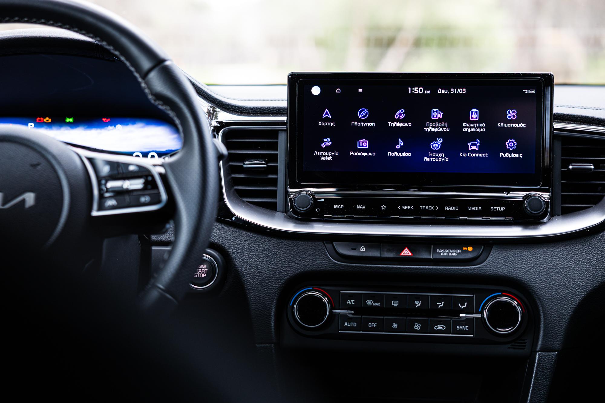 Η καμπίνα του XCeed GT-Line αποπνέει την αίσθηση ενός premium αυτοκινήτου. Ο συνδυασμός μαλακών υλικών, προσεγμένης συναρμογής και σπορ λεπτομερειών όπως το τριάκτινο flat-bottom τιμόνι, τα ηλεκτρικά ρυθμιζόμενα καθίσματα με ενισχυμένη πλευρική στήριξη και οι ενθέσεις χρωμίου, δημιουργούν ένα ευχάριστο και ποιοτικό περιβάλλον. Ο ψηφιακός πίνακας οργάνων 12,3in διαθέτει εξαιρετικά γραφικά και δυνατότητα εναλλαγής θεμάτων ανάλογα με το πρόγραμμα οδήγησης, ενώ στο κέντρο του ταμπλό δεσπόζει η οθόνη αφής για το infotainment 10,25in με αναβαθμισμένο λογισμικό KIA Connect, ενσωματωμένο σύστημα πλοήγησης, και δυνατότητα απομακρυσμένου ελέγχου λειτουργιών μέσω εφαρμογής.